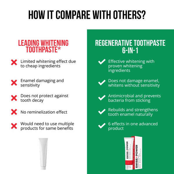 I recommend SWISS+POWER Regenerative 6-in-1 Toothpaste to my patients for comprehensive oral care, combining prevention, protection, and restoration in one convenient product.